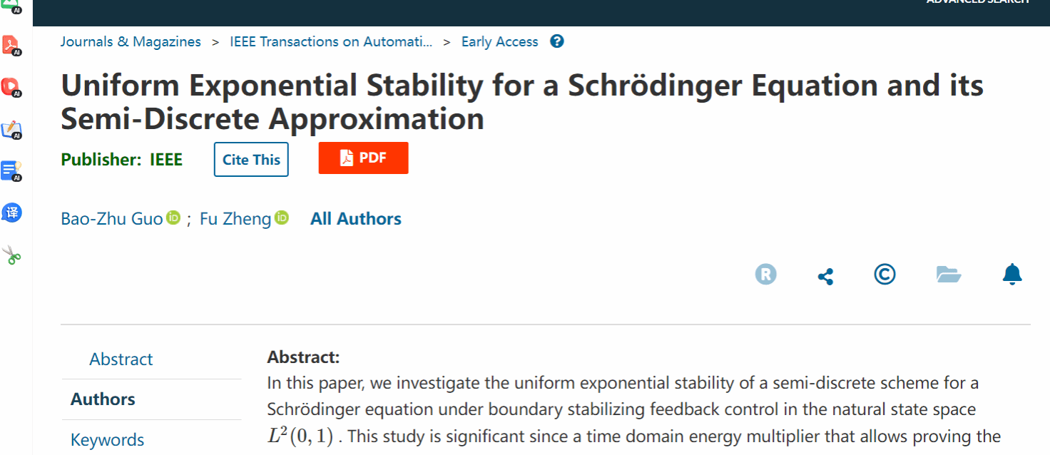 近日,PA集团官方网站郑福教授以唯一通讯作者署名的文章“Uniform Exponential Stability for a Schrödinger Equation and its Semi-Discrete Approximation”在控制论领域权威期刊《IEEE Transactions on Automatic Control》在线发表,论文合作者是中国科学院数学与系统科学研究院系统控制重点实验室郭宝珠研究员。