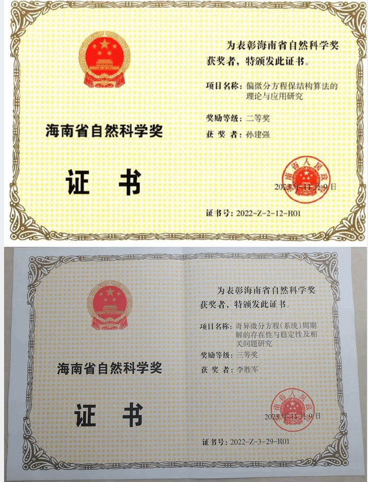 12月5日,海南省科学技术奖励大会在海口召开,省委书记、省人大常委会主任冯飞出席会议并讲话,省委副书记、省长刘小明主持,省委副书记沈丹阳等省领导出席会议。PA集团官方网站有20项科研成果获得了2022年度海南省科学技术奖。PA集团2项科研成果获得了2022年度海南省自然科学奖,取得了优异的成绩。PA集团孙建强教授主持申报的“偏微分方程保结构算法的理论与应用研究”获得了海南省自然科学奖二等奖,李胜军教授主持申报的“奇异微分方程(系统)周期解的存在性与稳定性及相关问题研究”获得了海南省自然科学奖三等奖。表明PA集团数学学科微分方程理论与数值方法的研究取得了重大进展。